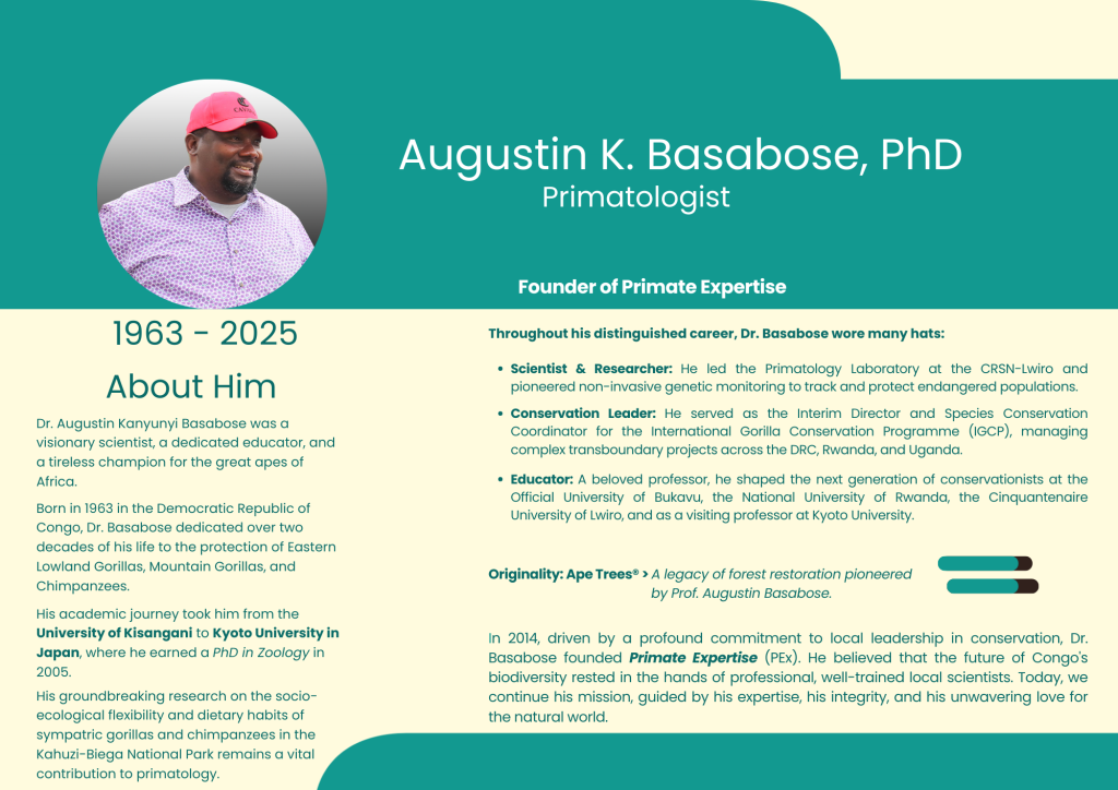 Doctor Augustin K. Basabose was a dedicated conservationist with over 30 years of experience in the protection of Great Apes in Central Africa, a leading expert in the socio-ecology of sympatric gorillas and chimpanzees, with specialized skills in non-invasive genetic monitoring and community-based conservation, leading efforts to empower Congolese scientists through the « Primate Expertise » (PEx) initiative.