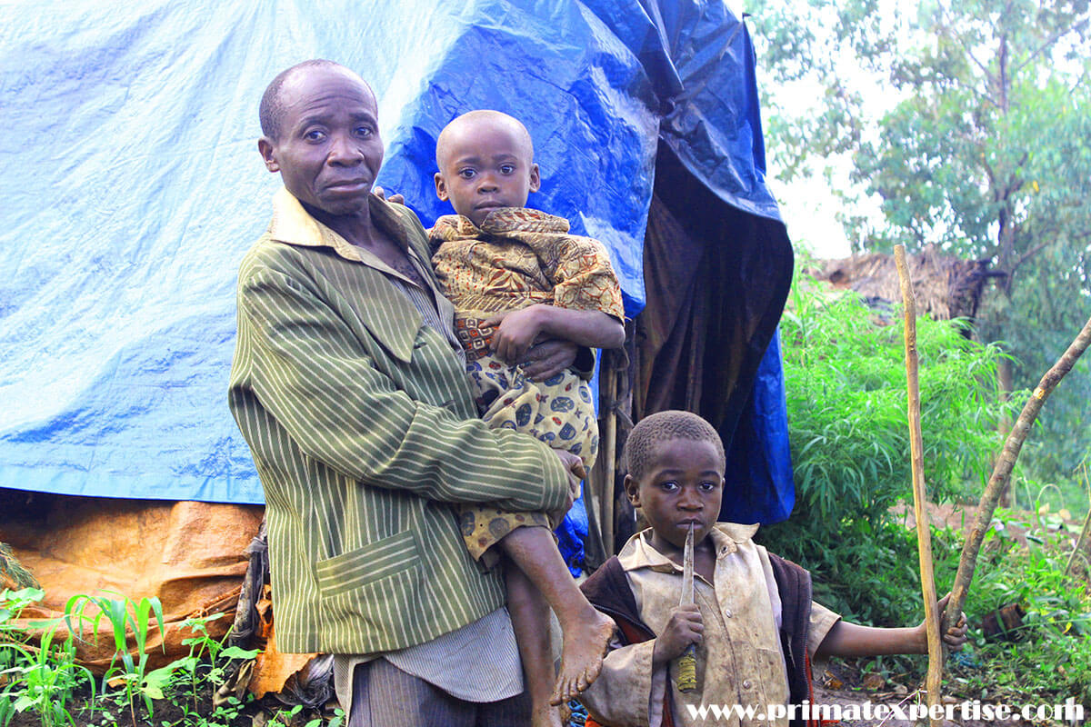 Mr. MAROC KAGANDA, a pygmy resident of the Buyungule village near KBNP. He has become a widower of 6 children since March 2018 when he lost his wife due to malaria. In his arms is his younger daughter MINANI of 3 years and the boy ASHUZA of 5 years standing beside.
