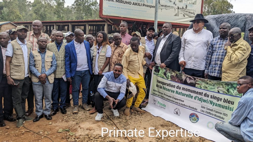 Dans le but de sensibiliser la communauté insulaire d’Idjwi à la protection de la biodiversité de la Réserve Naturelle d’Idjwi-Nyamusisi et promouvoir le tourisme sur l’île d’Idjwi, Primate Expertise (PEx) avec son partenaire Wild Earth Allies (WEA) ont, en collaboration avec la Fondation Kahimano pour le Développement (FOKAD asbl) et l’honorable Mwami Ntambuka Mihigo Roger, inauguré ce samedi 4 janvier 2025, le monument dédié au Singe Bleu de Bulolero-Idjwi. Cette espèce emblématique, qui habite la Réserve Naturelle d’Idjwi-Nyamusisi (RNAI), fait l’objet d’une attention particulière dans le cadre de cette initiative.